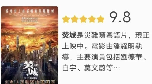 而11月1日行将上映的《焚城》,却是香港首部灾祸片巨制!致使点映阶段,就达到了9.8分的高分,将不雅众的期待值拉到最高。