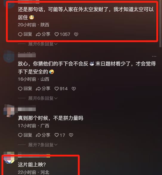 对此,也有网友给出了我方的评价,“季世的期间,我不信打工东谈主还快意当牛马”,“有钱不一定有效,但有权就一定有效”,致使有网友发出疑问:这片能上映?