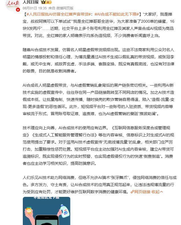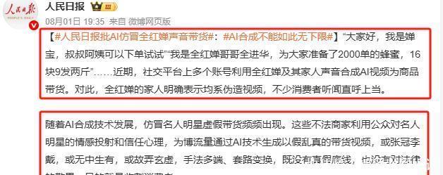 央媒重拳出击 8月1日,东谈主民日报发文叱咤, AI合成不可如斯无下限!金额浩大者涉刑事坐法! 半月谈同步揭露骗局骨子,哄骗公众对体育明星的信任敛财,法律层面,北京互联网法院2024年已判决宇宙首例“AI声息侵权案”, 明确当然东谈主声息受法律保护。