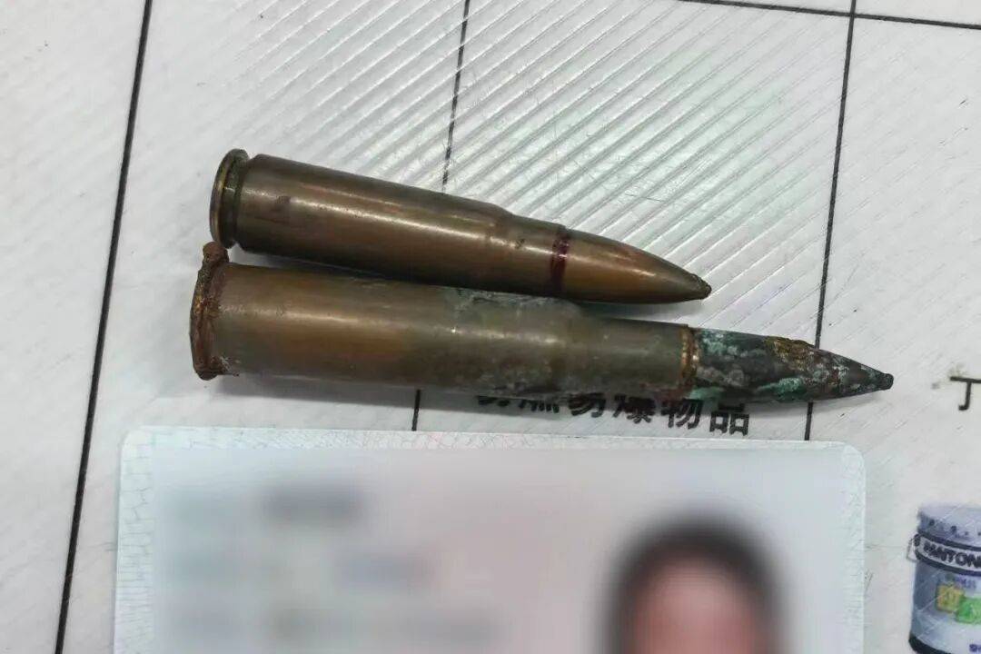 接报后,捏勤民警张德超速即赶到现场,对该游客捎带的玄色行李箱进行开包查验,并在行李箱中部一个蓝色文献袋内查获枪弹两枚。经勘查,其中一枚枪弹弹体完整,底火呈棕色且保存圆善,初步判断仍具击发可能性,存在安全隐患。