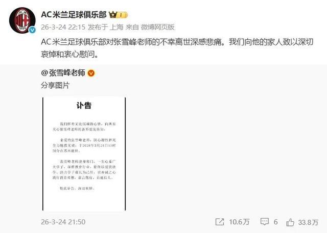 张雪峰走了。他是一位憨厚,亦然一个AC米兰球迷,一个在绿茵场上踢中后卫的东谈主。他离世后,AC米兰俱乐部发来的乱骂,让好多东谈主动容。这份跨越国界的眷注,是足球这项通顺最动东谈主的部分。