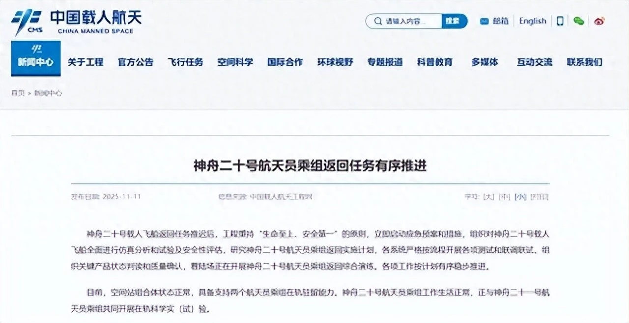 中国载东说念主航天办公室11月5日先通报了推迟复返的事,说是为了安全起见,得仔细评估风险。原野心那天就落地,当今得等等。空间站上还有神舟二十一号飞船,神舟二十二号在地上待命,这“一发一备”的机制便是防着这种突发。